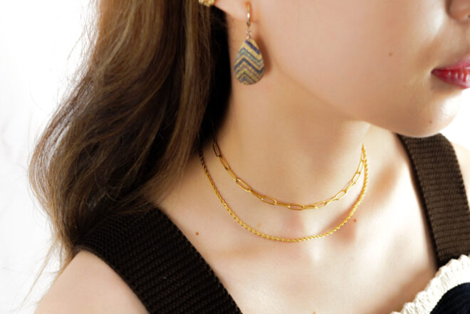 一本ずつ着けてもしっかり存在感があり、さらに重ね着けでより首元が華やかになります。